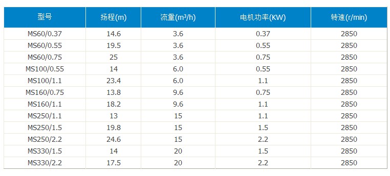 同系列南方泵技術參數如下:
