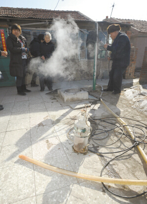 昨日上午,記者來到艾大娘家,還沒等進(jìn)院就看見井里冒出來的熱氣。艾大娘說,以前從來沒出過這事。說著,又從井里打上來一盆水,記者用手試試溫度,這水還真燙手。隨后,艾大娘拿出一個雞蛋放到水里,一會兒工夫,剝開雞蛋,蛋清基本熟了。