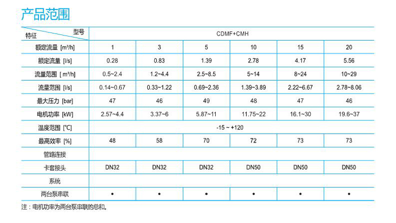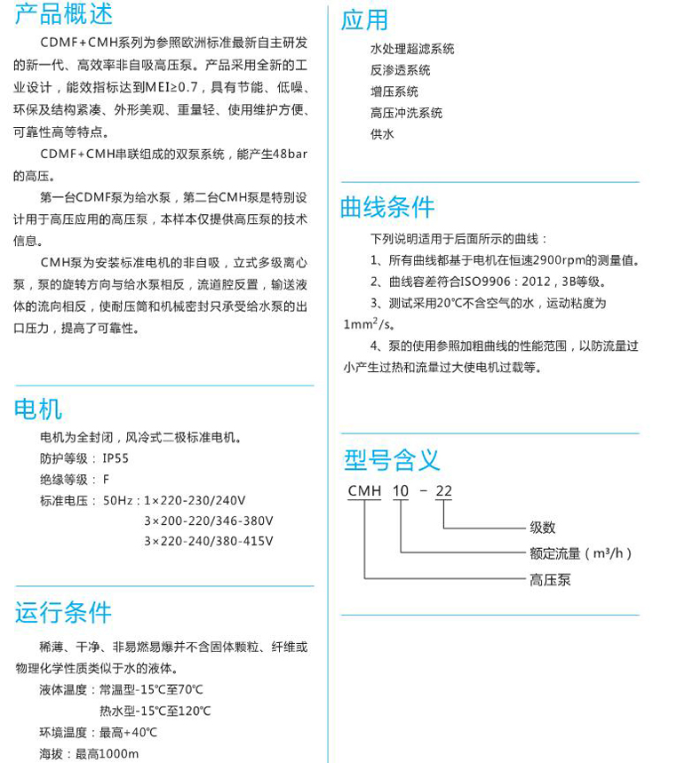 CDMF+CMH系列為參照歐洲標準自主研發的新一代、高效率非自吸高壓泵。產品采用全新的工業設計,能效指標達到MEI≥0.7,具有節能、低噪、環保及結構緊湊、外形美觀、重量輕、使用維護方便、可靠性高等特點。